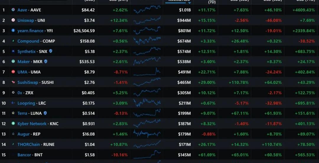 2020年初,与DeFi相关的代币交易量并不多,它们只是19年底充斥市场的一小部分。然而每一个新的协议都需要有自己的治理代币,而这些代币则被“堕落的农民”或者“degens”疯狂地开挖,以寻求快速盈利。自然而然的,巨鲸和内部人士从这场“耕作”狂潮中获得了巨大的财富,而那些寻求短期收益的小散户们则普遍地遭受了损失。只要晚几个小时投资一个新项目,就往往会导致痛苦的结局,因为那些内部人士已经带着战利品离开了,并把新分发的代币又扔回了市场。无论如何,回到2020年年初,DeFi行业内领先的代币和平台是Maker的MKR,今年第一周的时候其价格为440美元。在前100名的加密资产中,还有Synthetix的SNX,交易价格为1.13美元。如果将Chainlink也视为是DeFi代币的话,它当时的价格为1.81美元。0x协议代币ZRX当时的交易价格约为0.187美元,Augur的REP价格为9.46美元。KyberNetwork的KNC在前100名之外,交易价格为0.21美元,比特币封装协议代币REN的价格为0.035美元。Loopring的LRC价格为0.022美元,而Aave的LEND代币价格仅为0.016美元。前200名之外还有Bancor的BNT、Gnosis的GNO、THORChain的RUNE和KAVA。这几乎囊括了今年年初DeFi相关的主要代币。而在低市值代币中,MelonProtocol的MLN代币并不为人所知,其当时的交易价格约为2.9美元。以上2020年初的价格取自Coinmarketcap1月第一周的历史快照。
