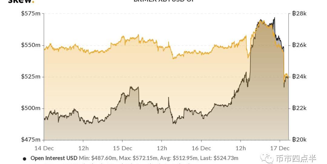 据skew统计的数据显示,过去15小时内BitMEX比特币合约报价相比Coinbase现货报价出现持续溢价,且凌晨时段溢价峰值水平一度迫近0.3%,从中长期视角来看已经达到了一个相当高的水准,与此同时BitMEX合约开平仓以及爆仓数据也表现出了市场高度活跃的态势。