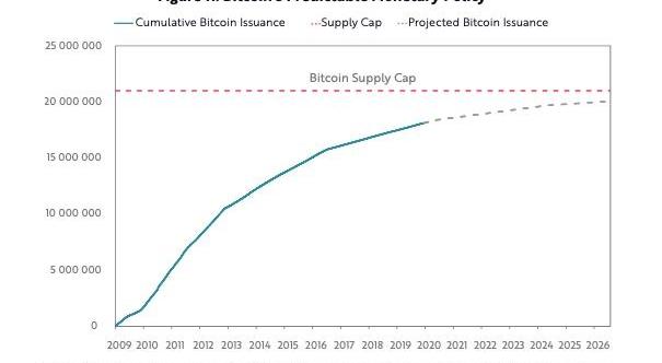 来源:CoinMetricsNetworkDataCharts和货币不同,比特币的总量是有硬性上限的。每隔四年就会发生一次产量减半,直到达到2100万比特币的供应上限。这意味着我们可以很好地预测未来,并明确1年、5年、10年后比特币的通胀率会是什么样子。