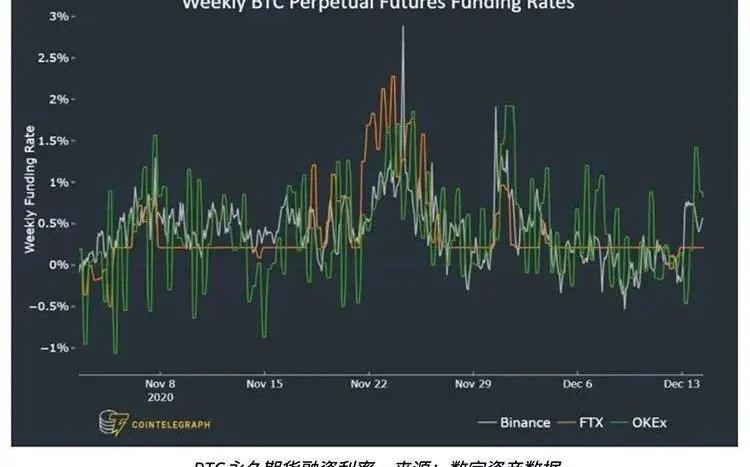 当买方是要求更多杠杆的人时,资金利率就会变成正数。因此,买方将是支付费用的人。这个问题在牛市运行期间尤其如此,因为此时通常对多头有更多的需求。每周2%以上的可持续利率转化为极度乐观。这个水平在市场上涨期间是可以接受的,但如果BTC价格横盘或处于下跌趋势中,则会出现问题。在这样的情况下,买家的高杠杆增加了在价格意外下跌期间进行大规模清算的可能性。请注意,尽管12月11日比特币下行走低,但周资金利率还是成功避免了负值区域。这一数据表明,空头(卖出)和多头(买入)交易者使用的杠杆大致相同。这样的指标可以认为是中性的,因为双方都有余力来增加注。期货溢价回归正常