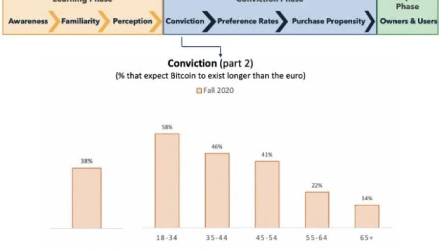 在评估「强烈」或「有点」同意「比特币是金融技术的积极创新」上,认同这一观点的调查结果百分比也上升了2个基点——从2019年春季的43%上升到2020年秋季的45%。在2020年这次最新调查中,这项指标存在一定年龄偏向,其中年轻人群仍然最倾向于对比特币持乐观态度,具体来说:18-34岁人群中有60%「强烈」或「有点」同意「比特币是金融技术的积极创新」,比2017年秋季增加了12个百分点);35-44岁人群中有58%「强烈」或「有点」同意「比特币是金融技术的积极创新」;45岁以上人群中只有33%「强烈」或「有点」同意「比特币是金融技术的积极创新」。「肯定阶段」:肯定、相对偏好比率和购买倾向