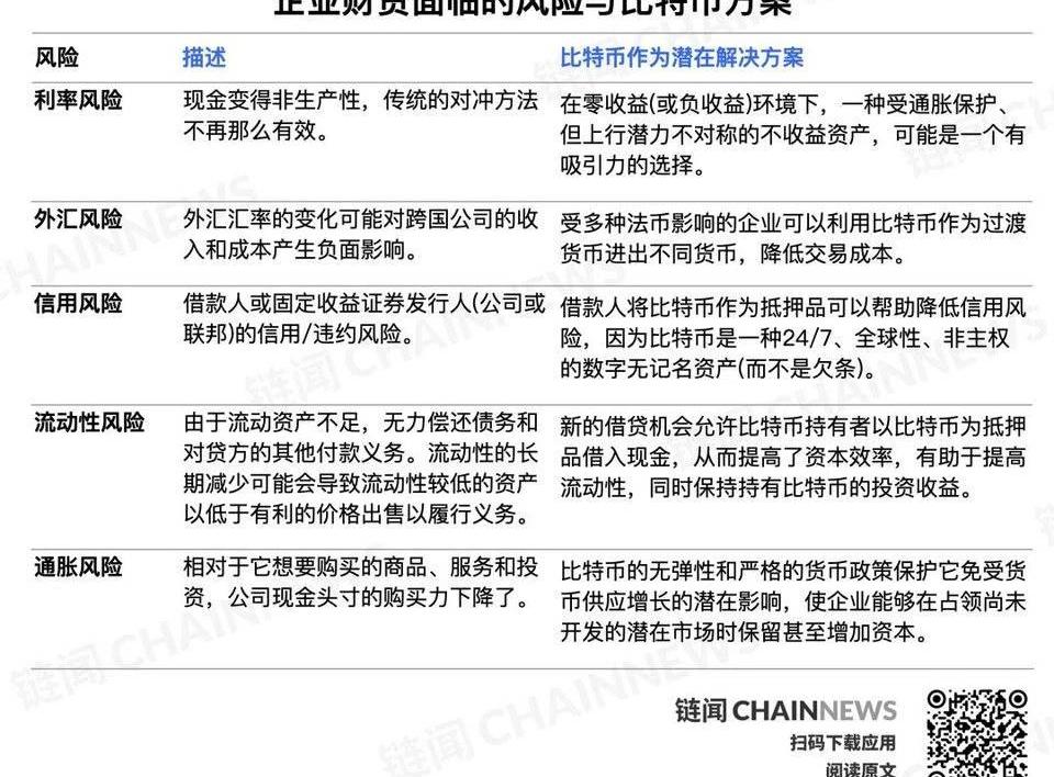 现金流和盈利能力正如我们在《比特币作为另类投资的作用》报告中所讨论的那样,比特币通常与健康和经济危机造成的需求冲击无关。因此,当核心业务和其他潜在投资受到经济状况的不利影响时,公司也可能从比特币的多样化优势、潜在的优异表现和流动性状况中受益。比特币提供了长期投资的上行潜力,同时提供了短期投资的流动性概况。因此,对比特币的配置可以让企业购买力在一段时间内得以保持和增长,在低盈利和现金流时期提供缓冲,同时保持足够的流动性来偿还短期债务。利率比特币和黄金等资产有时会受到批评,因为它们本身并不产生收益。然而,在收益率为零或低于零的情况下,配置比特币的机会成本已显著下降,持有风险回报不对称的非收益资产的吸引力已经显著上升。正如机构投资者正在重新评估他们在固定收益证券发行中的配置,我们看到一些企业财资也在做同样的事情。印钞和潜在的通胀比特币是一种可验证的稀缺资产,拥有透明的货币政策,这与法定货币供应的无限扩张形成了鲜明对比。比特币货币政策的无弹性和可预测性,以及这些特征日益增长的重要性,帮助推动了比特币的「价值储存」说法。换句话说,某些机构投资者和企业已经开始将比特币视为一种新兴的价值储存手段,它可以从固定数量资产的资产膨胀中受益,以及/或在法币购买力因潜在的消费者价格膨胀而下降的情况下,提供一种财富保值工具。比特币风险管理小结正如我们上面讨论的,财资主管在管理现金时面临多种风险,其中许多风险由于当前的健康和经济状况而加剧。随着企业寻找优化资产负债表的新方法,许多企业开始转向比特币,以抵消潜在的损失。在这个表格中,我们总结了企业财资在经济增长和衰退时期面临的许多风险,以及比特币如何提供一个潜在的解决方案。