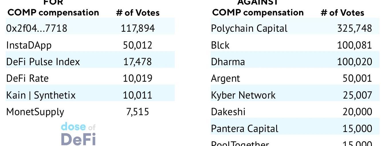 编者按:本文来自巴比特资讯,作者:ChrisPowers,编译:隔夜的粥,星球日报经授权发布。自今年夏天以来,“治理”一词一直处于DeFi的中心位置。很难想象,在六个多月以前,在链上用代币进行治理的DeFi项目还仅仅只有Maker等少数几个项目。而随着6月份Compound推出COMP代币之后,DeFi迎来了“治理代币”的新时代。这些代币主要被用作激励或奖励机制,同时也控制了链上协议,在很多情况下还控制着金库。现在,Compound正面临着其首次重大治理测试,持币者需要关于“遭受清算的Compound存款人是否应得到赔偿”而进行投票。。现在,kybx86提出了一项提议,通过给受影响的地址分配5.5万COMP来补偿遭到清算的Compound用户。该提案在这周一早上遭到了否决,其中有681,290COMP投票了“否定”,另有212,592COMP投票了“赞成”。