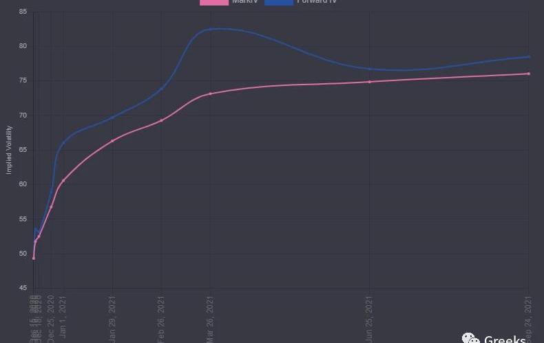 BTC历史波动率10d49%30d65%90d52%1Y79%期权成交量4.43亿美元,持仓量稳定,目前为39亿美元,市场相对平静。各标准化期限隐含波动率:今日:1m62.8%,3m69.5%,6m75.4%12/13:1m59.1%,3m67.2%,6m73.5%各期限的IV因为价格拉升而上涨,目前市场规律比较明显,IV会在横盘期间下降,反弹期间企稳,明显上涨时反弹,略滞后于价格移动。