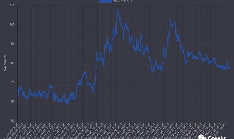 ETH历史波动率10d91%30d90%90d74%1Y103%以太坊今日期权持仓量7.09亿美元,成交量0.47亿美元,以太坊持仓量稳定。各标准化期限IV:今日:1m75%,3m84%,6m86%12/8:1m73%,3m83%,6m90%以太坊的短期IV明显低于中远期,现在差价大约是10%的IV,恢复到以太坊几个月前的水平。