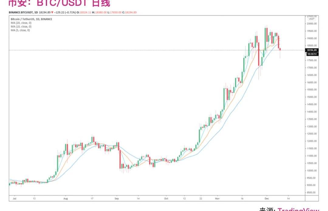 过去两周内,比特币价格的上升势头较弱,在艰难地持续反弹突破20000美元附近的历史高点后,就出现了大幅回落。12月8日到9日,BTC在币安上的价格从19167美元跌至17650美元,跌幅约9%。BTC在11月同样出现了一次大跌,11月26日,BTC价格回调至16188美元,在短短两日内跌幅达8.6%。比特币价格自11月以来的大跌有三个潜在的原因。首先,比特币近20000美元的高点正在成为一个难以突破的阻力位。其次,自12月初以来,高净值投资者存入交易所的比特币数量开始增加。第三,在12月1日迎来一个高峰后,比特币市场的整体成交量有所下降。