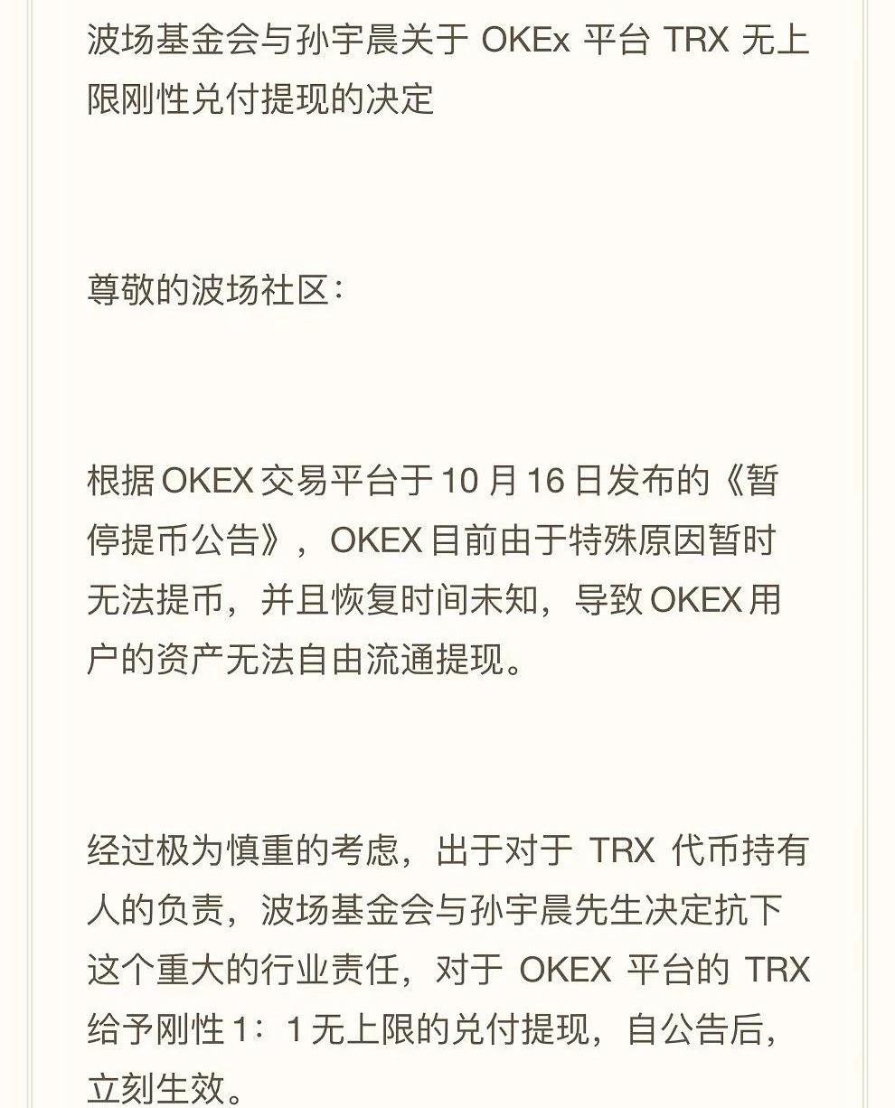 就在市场一片恐慌中,沉寂多日的波场创始人孙宇晨,再次演绎「孙迟但到」,推出「OKEx上TRX无上限刚性兑付」。如下所示: