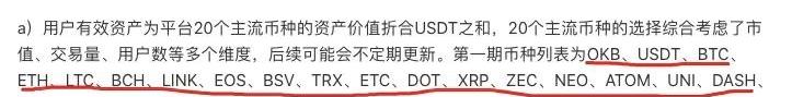 根据公告,OKEx将根据用户在平台的有效资产比例及交易量比例,以BTC形式发放给所有用户:——资产瓜分部分,用户可以收到的鼓励金=当周平台合约手续费收入*10%*用户日均资产总价值/所有用户日均资产总价值之和。——交易量瓜分部分,用户可以收到的鼓励金=当周平台合约手续费收入*10%*用户日均交易量/所有用户的日均交易量之和。简单理解,用户在OKEx持仓越多、交易越多,获得的奖励也越多。当然,为了照顾大多数投资者,OKEx规定,如果用户日均资产总价值>10,000USDT,按照10,000USDT计算,如果用户日均交易量>30,000USDT,按照30,000USDT计算。值得注意的是,OKEx在计算用户有效资产时综合考虑了市值、交易量、用户数等多个维度,最终选取了20个主流币种,既包含BTC、ETH等传统头部币种,也包含LINK、DOT等新兴明星币种。当然,这份名单不是一成不变的。公告中明确指出,后续可能会不定期更新。也就是说,如果投资者目前手中的资产不在这份名单中,不用着急,因为后期可能会出现,更何况距离第一期空投还有一周时间,投资者如果希望获得空投礼包,完全有足够的时间持有或交易这些主流币种。5.OKB持有者福利:2倍计算资产价值