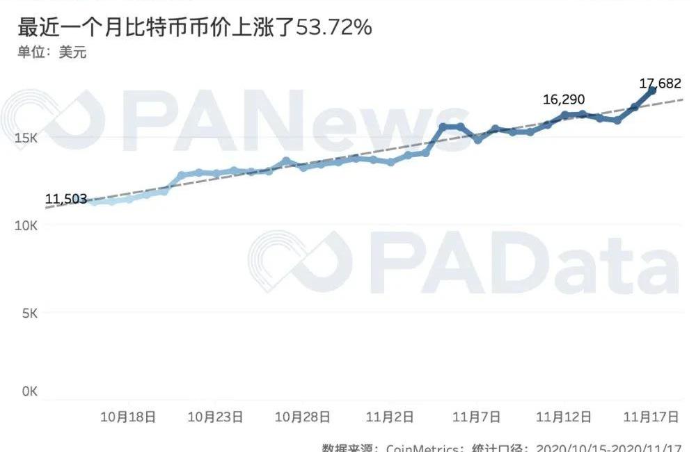 根据CoinMetrics的统计,最近一个月,比特币从10月15日的11503美元一路“高歌猛进”至11月17日的17682美元,涨幅高达53.72%。