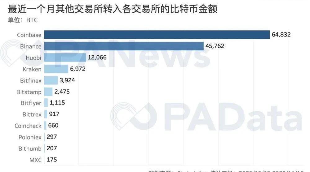 从趋势来看,OKEx、Binance和Bybit都抓住了此次比特币币价上涨带来的市场机会,三家交易所最近一个月的期货持仓量分别上涨了21.51%、64.32%和45.45%。其中,Binance的比特币期货持仓量增幅显著,表现抢眼。另外,Huobi和BitMEX的期货持仓量则基本保持稳定,没有明显变化。Binance和Huobi流出量多,Coinbase仍然最“吸金”