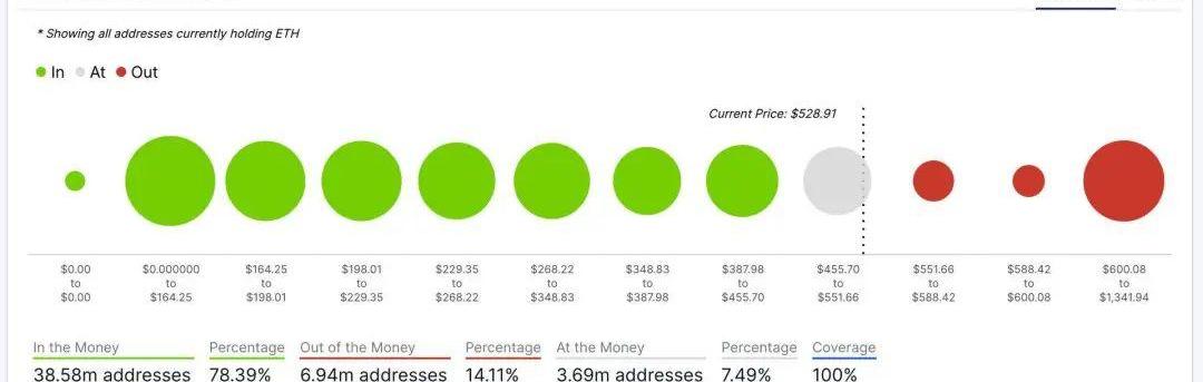 以太坊当前价格下,有多少ETH账号处于盈利状态?已盈利(IntheMoney)地址数量和比例,反应了目前以太坊投资者的整体投资仓位成本。根据链上数据分析公司Intotheblock的数据,我们可以从地址数量和以太坊数量两个角度来比较。就目前的以太坊现货价格528美元而言,持有以太坊地址中78.39%已实现盈利,约为3858万个地址。目前没有实现盈利的地址数量大约有694万个,约为14.11%。另外有7.49%的地址处于盈亏平衡状态。