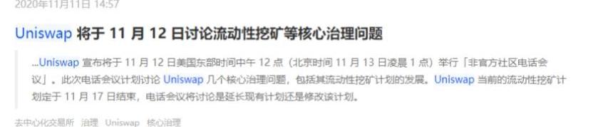 ETH交易对的流动性变化从交易量来看,我们可以迅速得到第一个问题的答案:ETH流动性池的撤出并没有对Uniswap的交易量产生太大影响,Uniswap的流动性池依然能够满足日均3亿美元的交易需求——这已经远超大多数二线交易所的交易量。验证第二个问题需要考虑的因素则比较多,但我们通过UNI的价格表现和新闻媒体的内容发布可以发现一些端倪。11月5日,UNI的价格跌到了底部,随后跟着大盘的上涨开始放量拉升。直到11月10日,上涨开始放缓。11月11日,媒体开始发布Uniswap即将举行电话会议讨论治理问题,人们开始意识到UNI的流动性挖矿将在一周后结束,产出将减少,于是开始第二波拉升,直至停矿降至,获利盘了结,顶部出现。