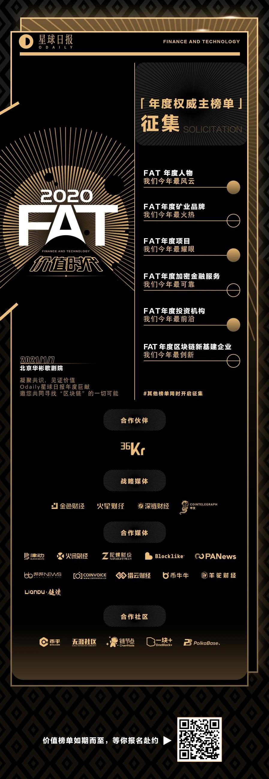 其他榜单开始同时征集:「引领热度榜」——线上投票FAT年度最受社区欢迎区块链项目奖FAT年度最受用户欢迎交易所奖FAT年度最受用户欢迎加密社区奖FAT年度最具影响力微博意见领袖这一年最火热的话题和最激烈的探讨,总是围绕着最核心的用户展开。用户们的喜爱程度直接决定了某一企业的人气。引领热度榜将由社区投票评选,并最终诞生出2020年的人气之王。「跨界榜」FAT年度最具潜力加密艺术家跨界榜将表彰最出圈和最精彩的区块链跨界时刻。这一年,区块链与不同领域的联合越来越紧密,其中,加密领域与艺术的结合尤为亮眼。Odaily星球日报将联合芭莎,评选出最具价值潜力的艺术家。「特别榜」坚守价值行业OG90后杰出从业者除了围绕着最火热和最跨界和最风云的之外,还有坚守在行业里的奠基者和开拓者。他们是行业的基石也是行业的未来。我们将用特别榜表彰这些行业价值奉献者。榜单结果将于1月7日在北京华彬剧院揭晓。我们将邀请这些行业亲历者、开拓者、探索者和坚守者共同出席颁奖盛典,探讨由「区块链」推动的行业变革、转型与创新。点击链接,报名2020FAT价值时代年度榜单:https://www.odaily.com/activityed2020