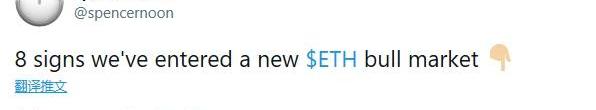 11月26日,以太坊目前正在从之前和30个月的峰值620美元大幅回落。但即便今天下跌了100美元左右跌到520美元附近,ETH自年初以来仍然上涨了300%以上。期待已久的信标链的创世块已确定启动时间,这是等待已久的“Serenity”ETH2.0升级的第0阶段,这一消息无疑是ETH价格背后强大的推动力,但这不是以太坊的唯一优势。除了ETH2.0的利好值得关注,多个维度的链上数据指标都表明以太坊上涨动力强大,甚至正处于新的牛市之中。11月26日,DTCCapital的SpencerNoon在推特上列出了一些关键图表,来表明我们已经进入新的以太坊牛市中的8个迹象。
