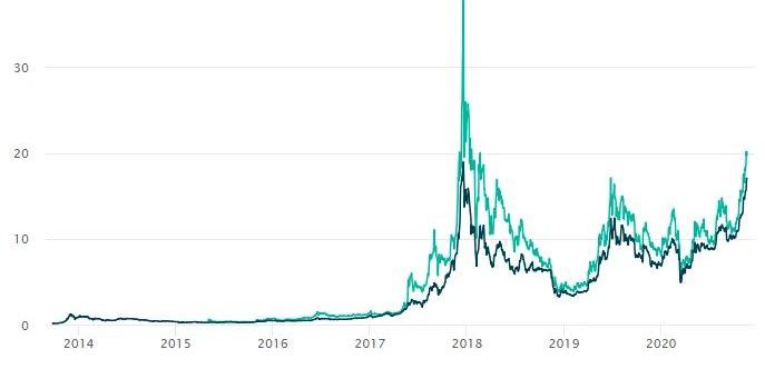 图1.灰度资产管理公司资产总规模资料来源:灰度基金官网当然,灰度基金受市场关注的另一个重要原因在于其高溢价性。例如,根据11月19日数据显示,每股GBTC价格为20.01美元,当前一股GBTC相对应的BTC价值为16.98美元,这相当于GBTC价格相对于现货价格高出了17.84%,存在明显的溢价。并且从2017年开始,GBTC就存在着长期并且稳定的高溢价。图2.GBTC的市场价格和净值