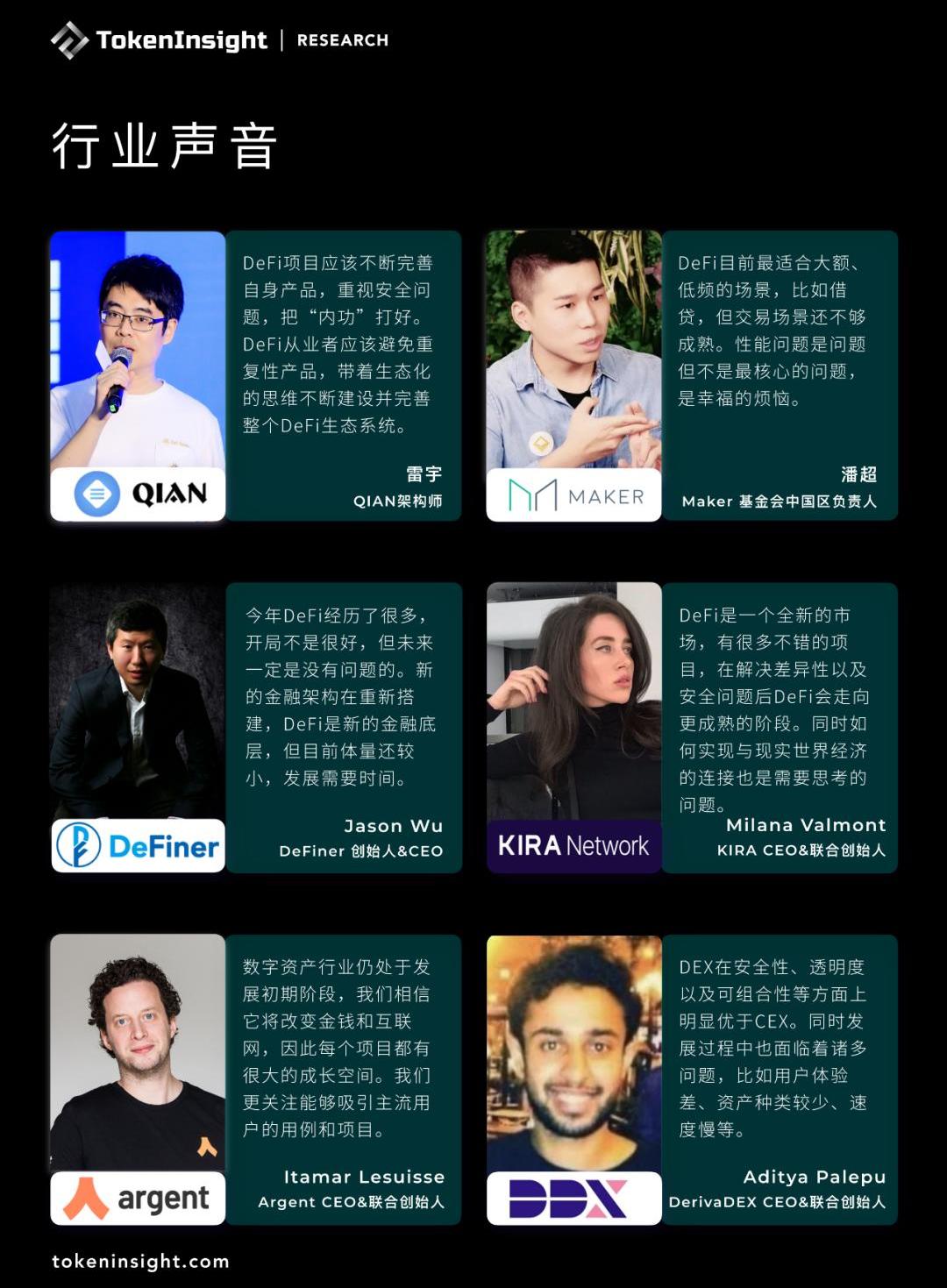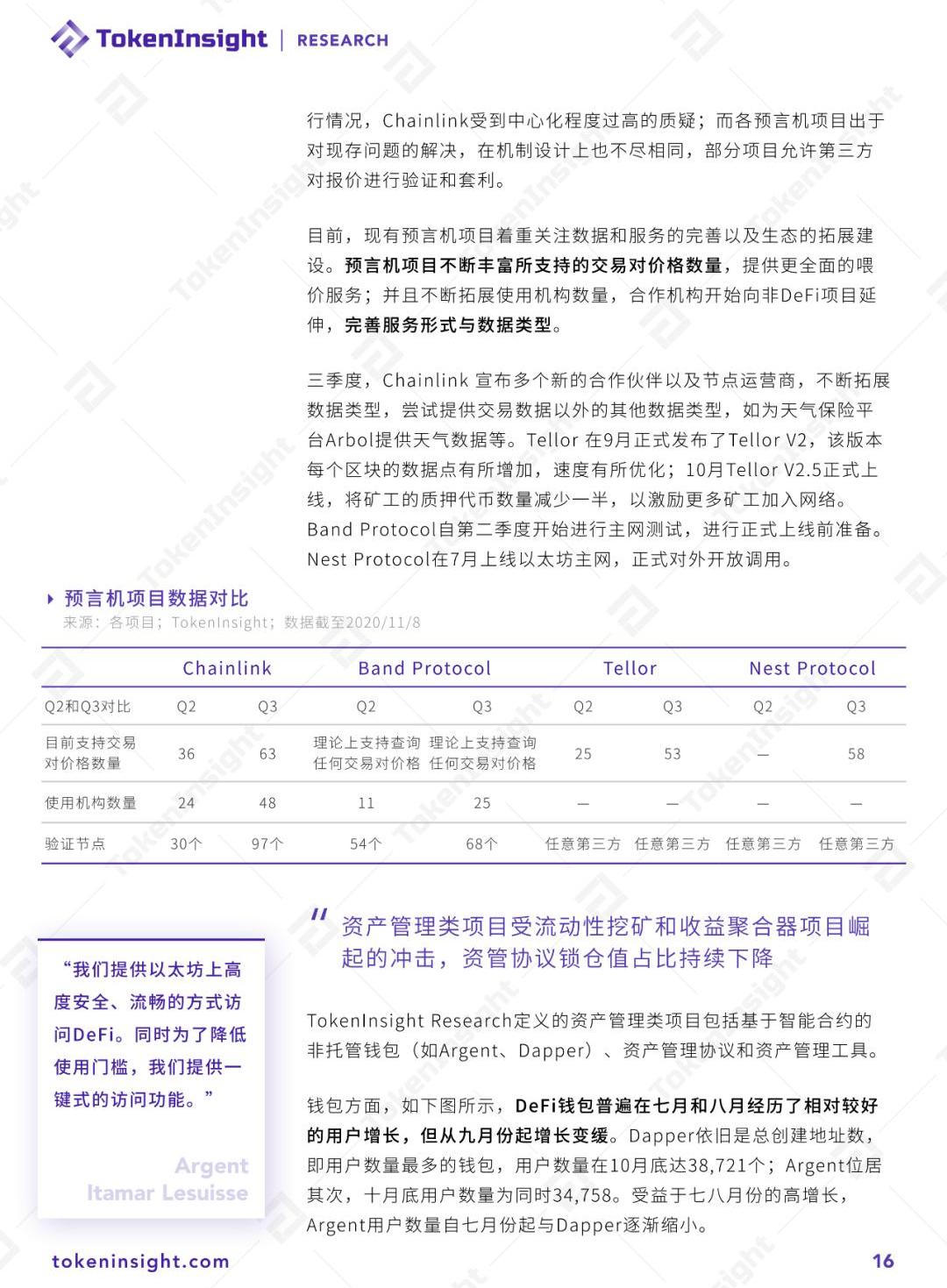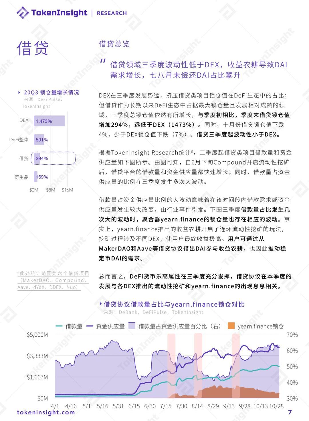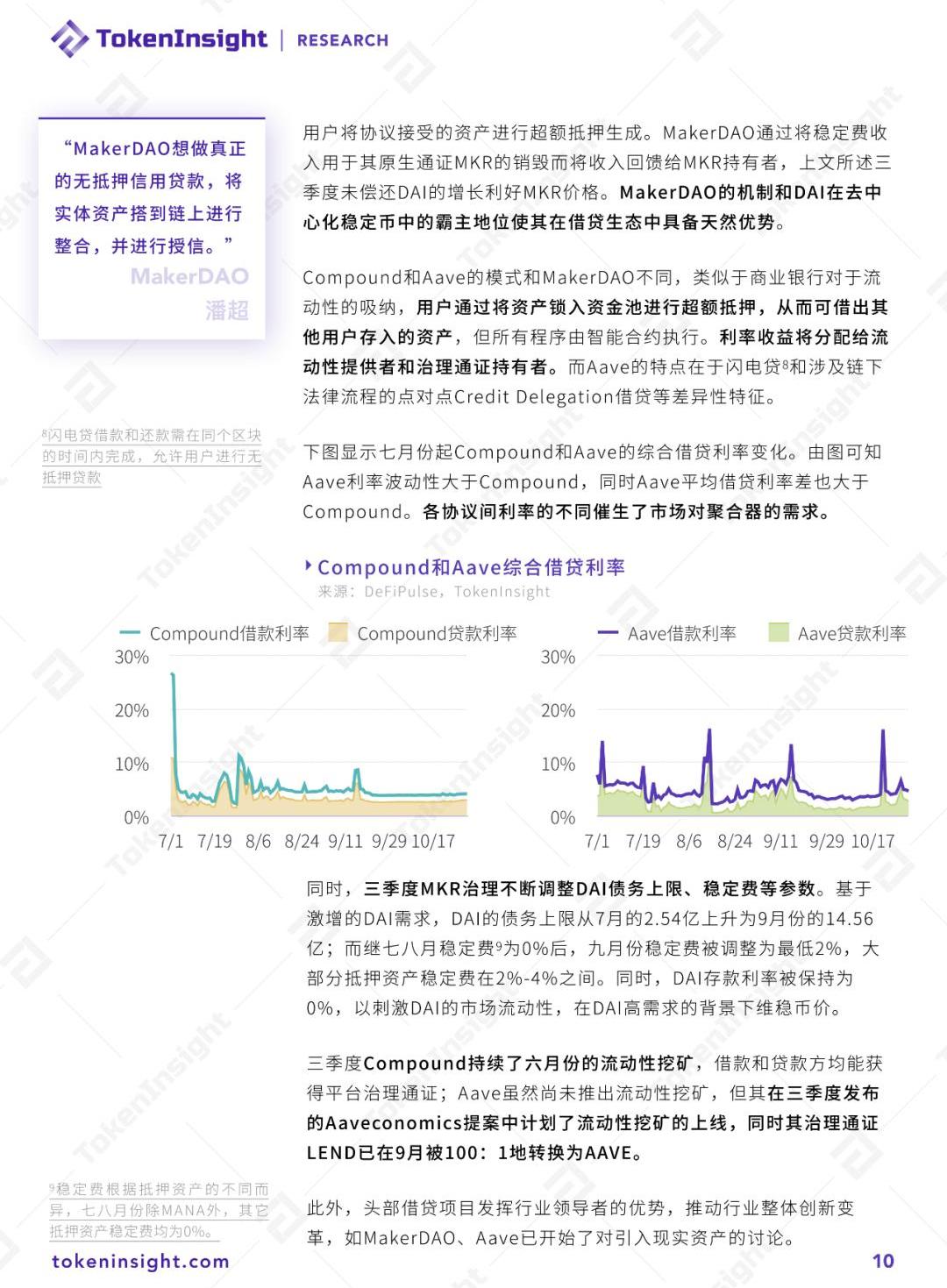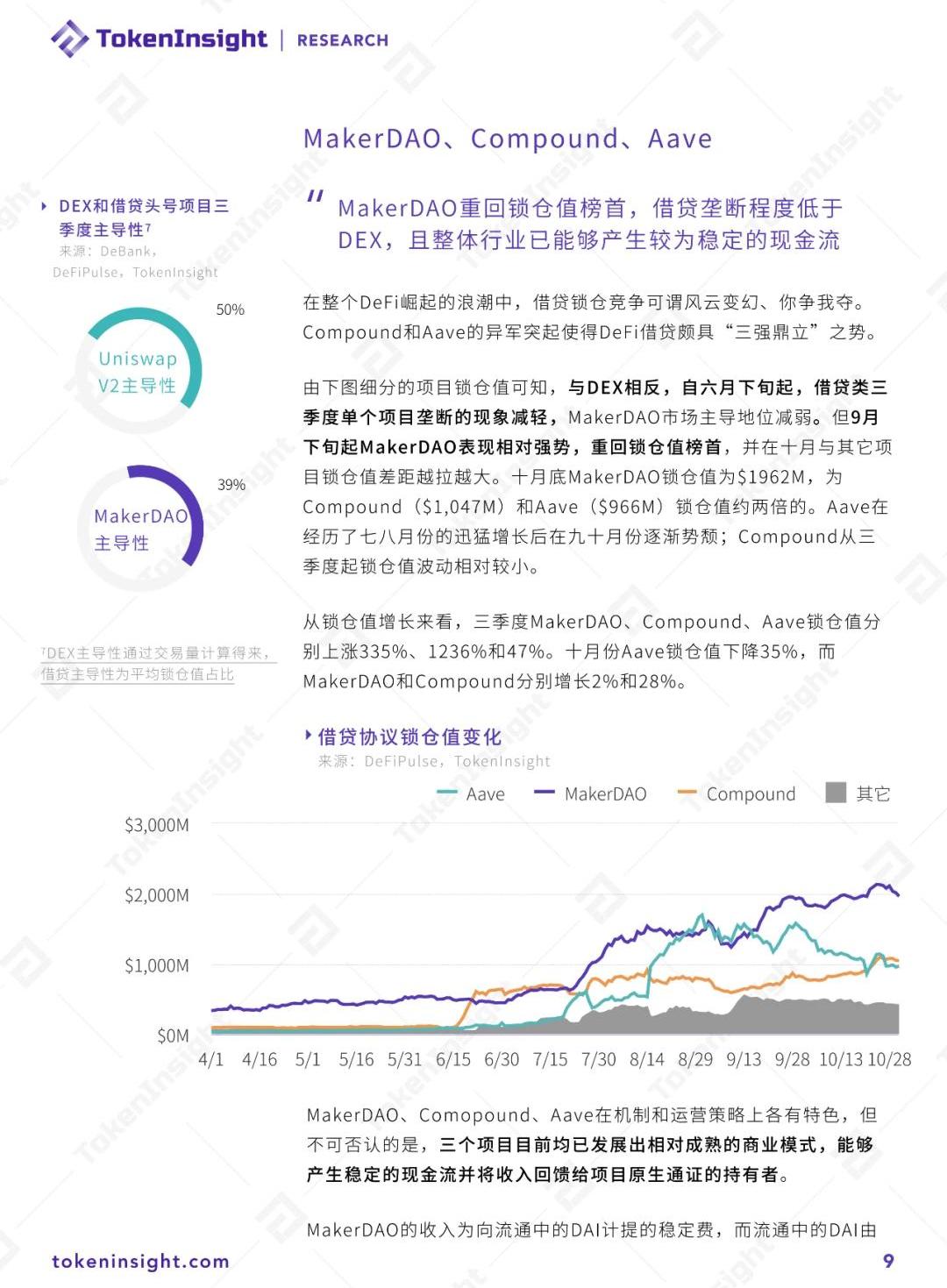 1.借贷领域季度末锁仓值较季度初增长294%,清算额为二季度的10倍;2.九月下旬起MakerDAO表现强势,重回锁仓值榜首,借贷垄断程度低于DEX,且整体行业已能够产生较为稳定的现金流;3.第三季度以太坊上去中心化稳定币发行量占比上升4.18%,DAI的发行量上涨527%,发行量在10月底达9亿美元;4.DAI、USDT、USDC为DeFi中未偿还债务最高的资产;5.WBTC锁仓量可以头部DEX和借贷项目媲美,九十月份锁仓值变化远优于DeFi整体水平;6.聚合器yearn.finance第三季度锁仓值翻97倍,YFI价格上线仅两周价格超过比特币,成为最贵的数字资产;7.预言机维持“一超多强”竞争格局,DeFi发展直接影响预言机使用量;8.资产管理类项目收到流动性挖矿和收益聚合器项目崛起的冲击,资管协议锁仓值占比持续下降;9.其它公链积极建设DeFi,但以太坊DeFi生态仍旧占据绝对优势。