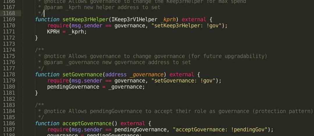 Keep3rV1:代码地址:https://github.com/部署地址:https://etherscan.io/Keep3rV1Helper:代码地址:https://github.com/keep3r-network/keep3r.network/blob/master/contracts/Keep3rV1Helper.sol部署地址:https://etherscan.io/address/0x93747c4260e64507a213b4016e1d435c9928617f如下图图一所示,Keep3r项目的Keep3rV1智能合约中定义了两个角色:governance与pendingGovernance。1178行setGovernance()函数允许当前governance角色将pendingGovernance角色设定为任意给定地址_governance。同时在1186行acceptGovernance()函数中,当前pendingGovernance可以将自己授权为governance角色。因此从逻辑上governance角色与pendingGovernance角色可以循环授权,且没有任何event事件可以提醒投资者governance角色与pendingGovernance角色的变更。此时,项目拥有者可以随意设置拥有两个角色的地址。