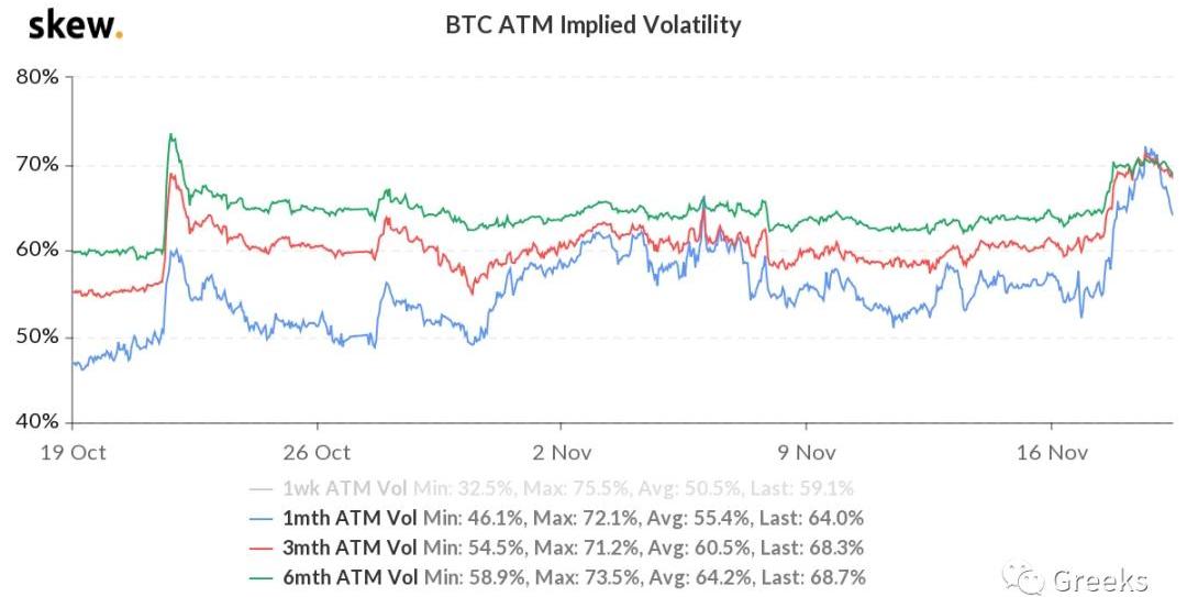 BTC历史波动率10d59%30d63%90d51%1Y78%期权成交量7亿美元,持仓量平稳,目前为35亿美元。各标准化期限隐含波动率:今日:1m64.9%,3m68.2%,6m68.5%11/18:1m67.8%,3m69.5%,6m70.4%前期高点:1m65%,3m70%,6m74%