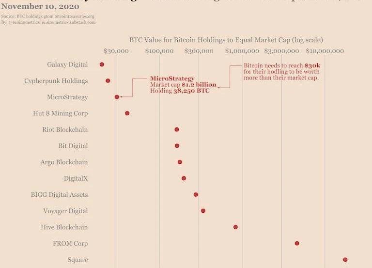 这其中有多少公司买入了比特币放入呢?确切的数字我们也不清楚,但如果未来几个月有更多公司宣布将比特币作为储备资产,我也不会感到惊讶。现阶段,这些上市公司面临所的一个大问题是:使用比特币作为储备资产对公司来说意味着什么?我们还没有足够多的数据来回答这个问题。但是我们可以做一道有趣算术题,我们可以为每一家公司计算当一枚比特币的价值到达多少时,这些公司手里币的总价值就等与公司当前的市值。以MicroStrategy为例,目前该公司的市值为12亿美元,它拥有38250枚比特币。这意味着一旦比特币的价格达到3万美元,该公司手里持有的比特币资产将与其市值一样高!而另一家市值82亿美元的公司Square仅持有4709个比特币。这意味着每枚比特币的价格需要达到1800万美元的价格时,其手里的比特币才能达到该公司的市值水平。考虑到这一点,你可能会认为比特币价值的上升对MicroStrategy的影响要大于它对Square的影响。但我们会看到它是如何发挥作用的。