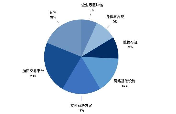 DCG投资企业地区分布来源:DCG官网按企业类型分类,DCG投资企业最多的方向为交易平台,比例为18%,其后分别是支付解决方案、网络基础设施、身份与合规等。值得注意的是,除了Acala等个别相关项目外,DCG几乎没有投资过DeFi相关的项目,频繁在推特发言的BarrySilbert在今年DeFi牛市期间也极少提及DeFi,反映出DCG对DeFi市场并不看好。