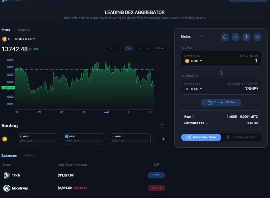 Aave和Compound是将其他代币打包成抵押代币的借贷协议。用户可以持有抵押币,但要将其解包,或打包成抵押代币,以及将它们迁移到另一个资产池中,就牵扯到发行它们的借贷协议。而在1inchv2中,用户只需要一笔交易就可以在1inch上完成所有这些操作,从而节省用户的时间和金钱。在1inch上,用户还可以轻松地交换池中持有的抵押币,所有的打包和拆包操作都能自动完成。5、降低交易失败的可能性1inch一直在努力降低失败交易的可能性,而V2版本的解决方案是部分和动态填充机制。当用户在1inch上进行交换交易时,1inch确保如果其中一个协议的兑换率发生了变化,则可以很容易地取消路由的一部分。相比失败的交易,用户未交换的代币部分,会返回到他们的钱包。动态组件可以让互换交易的一部分立即切换到分割或路径中的另一个协议。例如,一笔互换交易在Uniswap、Sushiswap和Balancer之间进行拆分交易。如果Uniswap的交易失败,整笔交易会切换到Sushiswap和Balancer。这使得互换交易仍然可以在用户可接受的兑换率范围内执行。6、互换交易开销优化1inchV2重新设计了聚合智能合约代理,以构建高度复杂的交易,这个新的智能合约完全是从零开始构建的。V2版本将直接互换交易聚合开销gas费成本降低到几乎为零。而复杂的交易也被优化到最小的gas成本。7、“最大回报”以及“最低gas费用”选项Pathfinder的新功能还包括“最大回报”和“最低gas费用”选项。如果用户选择了前一个选项,则将使用复杂的路由进行交易,以确保用户获得最佳兑换率。而在“最低gas费”选项中,互换交易是以市场价格进行的,这不需要在不同交易所或复杂的路径之间进行分割,这使得用户能够支付尽可能低的gas费用。