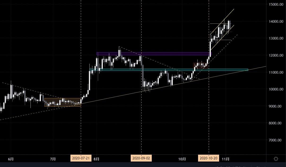 来源:QKL123上图为比特币自第二季度末以来的市场走势,整体可划分为四个阶段:第一阶段,方向选择。自6月以来至7月21日,整体形成一个三角收敛的形态,交易量和波动率同步降低,并在7月中前期于8970-9470区间窄幅震荡长达三周,最终选择放量向上突破,一举站在11000以上。第二阶段,订单消耗。自7月选择方向后成功站在11000,并反复在11000-12000区间震荡,整体呈现出一个“头肩顶形态”,并在11000附近形成颈线位。期间四次假突破12000,虽未能站上去,但成功对12000之上的订单进行有效的消耗,为其后期突破12000奠定一定基础。第三阶段,回调盘整。9月前期,BTC随DeFi泡沫破裂被带崩并跌破颈线位,但仍支撑在长期上涨趋势线之上,随着DeFi泡沫进一步破裂,资金回流大盘并缓慢上涨,接连突破短期下跌趋势线和前期颈线位,并在颈线位上方窄幅震荡进一步蓄力。第四阶段,再创新高。经过第二阶段对12000以上订单的有效消耗,10月后期,BTC一举放量突破12000,并一度达到14000,当前仍在短期上涨通道内运行,走势良好,且对14000之上的订单进行过两次消耗,短期有回调风险,具体推衍可参考第二阶段走势,还需配合基本面信息,近期美国大选也有可能会对币市造成一个预期上的影响。注明:以上分析不构成任何投资建议。1.2特色指标