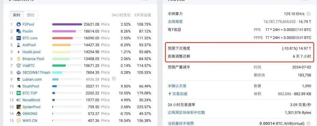 还是在BTC.com这个页面,还可以查预测的下次难度以及相对当前难度的变化幅度,还能查距离下一次难度调整的时间。