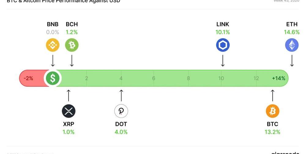 过去的一周BTC价格持续上涨,BTC自2018年初牛市以来首次超过1.5万美元,而且这种增长似乎还在继续,整个社区都回荡着强烈的积极情绪。在美国大选之后,股市已经开始反弹--但BTC的增长速度远远超过股市的回升速度,这加大了我们在过去几周看到的脱钩可能性的影响。如果BTC的增长轨迹继续下去,它可能会坚定地与传统金融市场脱钩,为其进一步增长打开大门。山寨币概况