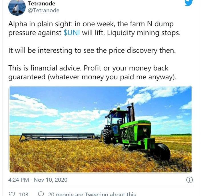 1900/1/1 0:00:00编者按:本文来自金色财经,Odaily星球日报经授权转载。Uniswap治理代币UNI的初始流动性挖矿将迎来尾声。据官方消息,Uniswap将于11月18日8时结束UNI流动性挖矿.