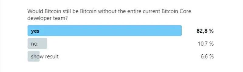 -如果没有整个BitcoinCore开发团队,那你认为比特币还是比特币吗?-至于另外两个问题,调查结果跟我预期的一样。受访者认为当前区块大小限制或当前核心开发团队本身并非“手段”,而是用来实现比特币核心价值观的手段的结果。例如,区块大小上限旨在确保比特币全节点能够负担得起成本,因为全节点需要验证整个区块链的历史,并与所有新挖出的区块保持同步。另外,区块大小上限还能确保区块补贴耗尽时区块空间的稀缺性。这样一来,来自用户的交易需求会为矿工带来足够的交易费收入。比特币的投票治理
