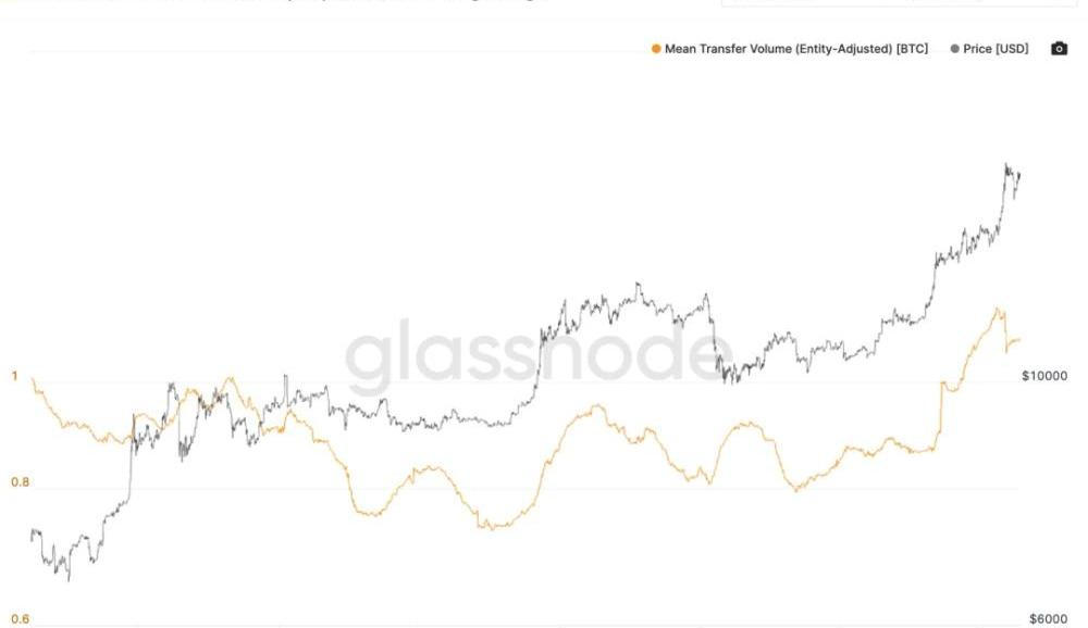 本轮大涨显示相当一部分高净资产个人介入,我们可以通过使用链上数据进行确认。这里有两个指标可以衡量:比特币平均转移量和投资者新增率。