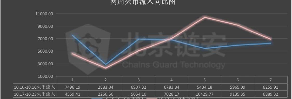 事实上,事发当日,我们即密切关注了火币和币安的链上交易情况,当时就出现两大交易所比特币流出数量快速增加,与此同时数字货币价格也出现了短时的普跌,作为头部交易所发生这样的黑天鹅事件对市场的影响还是很明显的。但是,这样的状况只维持了半天,次日两大交易所的数据即开始恢复到正常状态,而市场也很快摆脱了这一事件的影响,如比特币、以太坊等主流数字货币也重回当时已经启动的向上行情。接下来,我们就从比特币链上数据的动态变化揭示这一过程。首先看一个最直接的数据,即在事件发生前一周到本周五,也就是事件过去一周后的火币和币安两大交易所的比特币流入情况,具体日期是10月10日到10月23日。