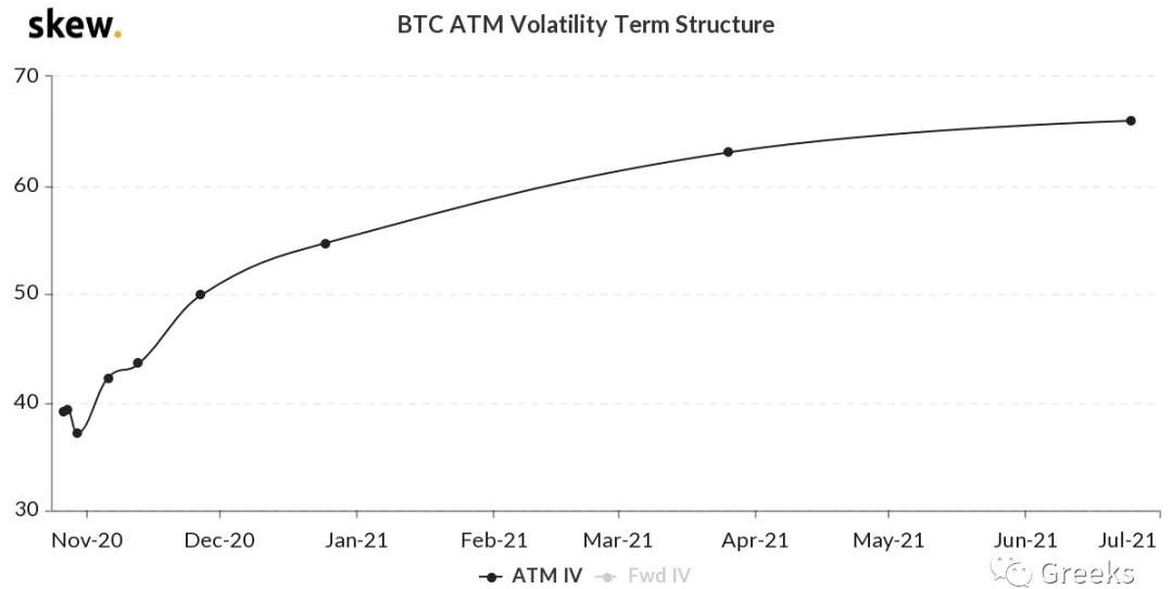 期权各期限IV平稳下降。目前价格不断冲击新高未果,比特币各期限IV已经接近行情来临之前。期权中远期的偏度skew维持偏移13%附近,短期恢复到6.7%,短期Call降价明显。从OptionFlows数据看,Call的成交下降明显,Put的成交开始反弹。