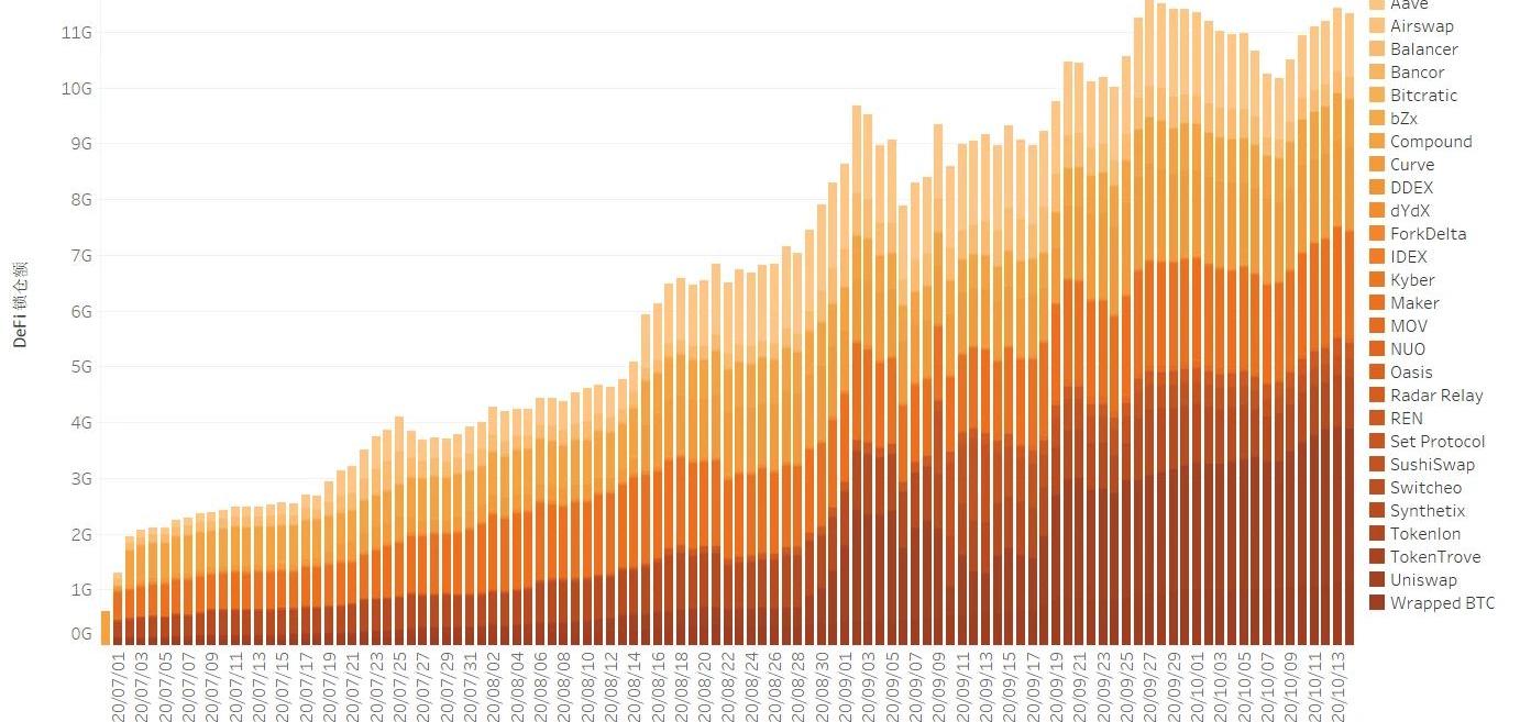 来源:QKL123,FTX上图为FTX的DeFi指数,该指数由一篮子热门DeFi代币组成,包括KNC,LEND,MKR,KAVA,ZRX,LRC,REN,REP,BNT,SNX和COMP,可用以反映DeFi市场的整体发展情况。如图所示,第三季度DeFi指数7月1日最低为1525,9月1日达到峰值3403.7,此后虽然大幅回落但仍高于7月之初,Q3整体发展可分为三个阶段:第一阶段,蓬勃生长期。自6月底Compound引领流动性挖矿之始,一大波流动性挖矿的DeFi项目蜂拥而至,包括DEX龙头Curve、Balancer,算法类稳定币AMPL以及保险赛道龙头NexusMutual,皆在7月初入场,流动性挖矿热潮随即开启,至9月1日SushiSwap流动性挖矿推动,市场达到高潮。第二阶段,急速回归期。自9月初,一度占领DEX市场份额前三的SushiSwap大事频出,对市场情绪影响较大,SushiSwap匿名创始人ChefNomi卖出devpool的全部SUSHI,造成SUSHI大跌,并带动市场下挫。此外,DeFi项目智能合约漏洞频出,SushiSwap仿盘KIMCHI.finance智能合约存在漏洞,智能合约拥有者可以利用漏洞,无限制地增发项目对应的代币数目,继而导致通胀并最终崩溃,其代币价格一日之间跌去72%;EOSDeFi流动性挖矿项目EMD合约emeraldmine1的大量质押资金被转移……至9月23日达到低谷。第三阶段,价值寻找期。在经历市场暴涨、暴跌之后的DeFi市场,流动性挖矿没有高年化的吸引,热度也逐渐褪去,资金逐渐回流大盘,推动比特币重回11000,DeFi指数在1800-2200之间小幅徘徊,进入价值寻找期。1.3市场概况