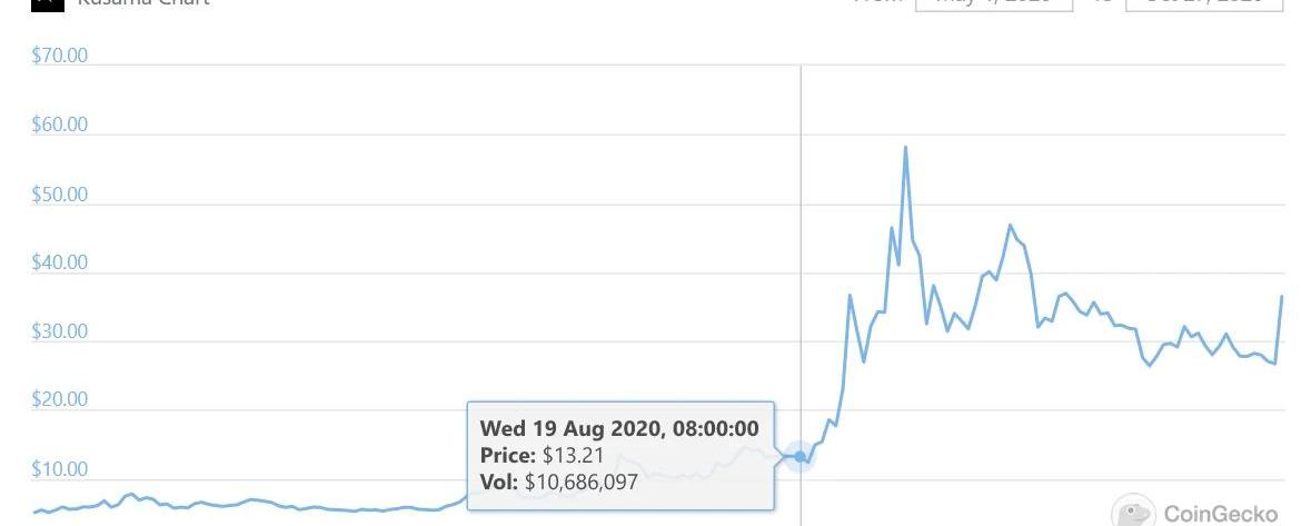 随后,在10月26日19:45左右,投票数开始暴涨,支持票数从原来的几千上涨到12万,反对数从0上涨到6100,此时,投票状态显示的是将被否决。由于Kusama网络采用的投票机制是Supermajorityapproval,即绝对多数参与投票的KSM同意才能通过议案。所以才会看到3677KSM赞成议案时通过,12万KSM赞成却处于否决状态,这是因为反对票从0涨到了6100。投票参与者暴涨的同时,KSM代币价格开始同步暴涨,从26日19:00至22:00,币价从27USDT上涨至38USDT,最高涨幅超过40%。