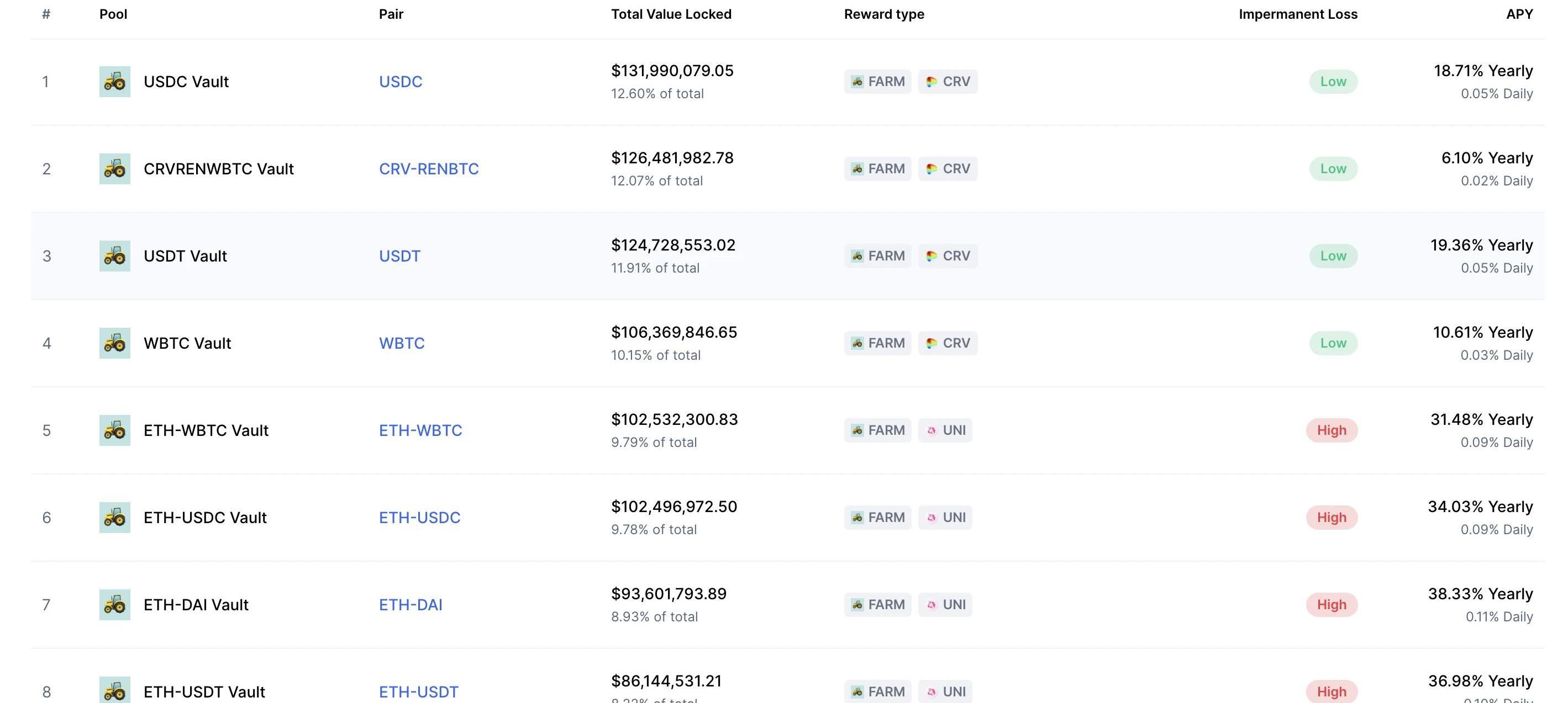 简单来说,Harvest.Finance在产品构成本身没有什么新意。其功能与套路与YFI如出一辙,即解决用户获得高收益的核心需求。其次,就是减少了用户对高收益策略的搜寻成本以及降低了用户的gas费成本。