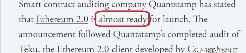 大家好,我是佩佩,他来了他来了,自国庆长假后,海外就一直有很多关于eth2.0即将到来的传闻,绝大部分小道消息指向2.0的0阶段将在数周内上线,也就是如果不出意外,在下个月我们就能见到eth2.0的首个版本。这也不是什么空穴来风,一是早在三个多月前,以太开发者就有透露希望在2020年内进入零阶段,另一点是昨天海外媒体信息:智能合同审计公司Quantstamp表示,Ethereum2.0几乎已经准备好发布了。在此之前,Quantstamp完成了对Teku的审计,Teku是由ConsenSys开发的Ethereum2.0客户端。