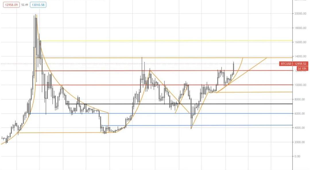LTC/USDindicatorsBTCBTC长期走势下图是BTC的长期走势图。2020年至今,BTC实现了正增长,BTC从年初的7200美元增长到现在的13500美元。涨幅几近100%。BTC目前有两个潜在的轨迹路径。第一条是倾斜的支撑线,是对称三角形的一部分,BTC最近突破了这个三角形。这将看到BTC回调至12000美元,再逐步增长。或者BTC将遵循曲线路径,与2017年和2018年类似。如果后者发生,那么BTC将击穿两个向上的阻力位,大幅上涨。在此番上涨之后,BTC可能会出现2017年和2018年类似的大幅回调。