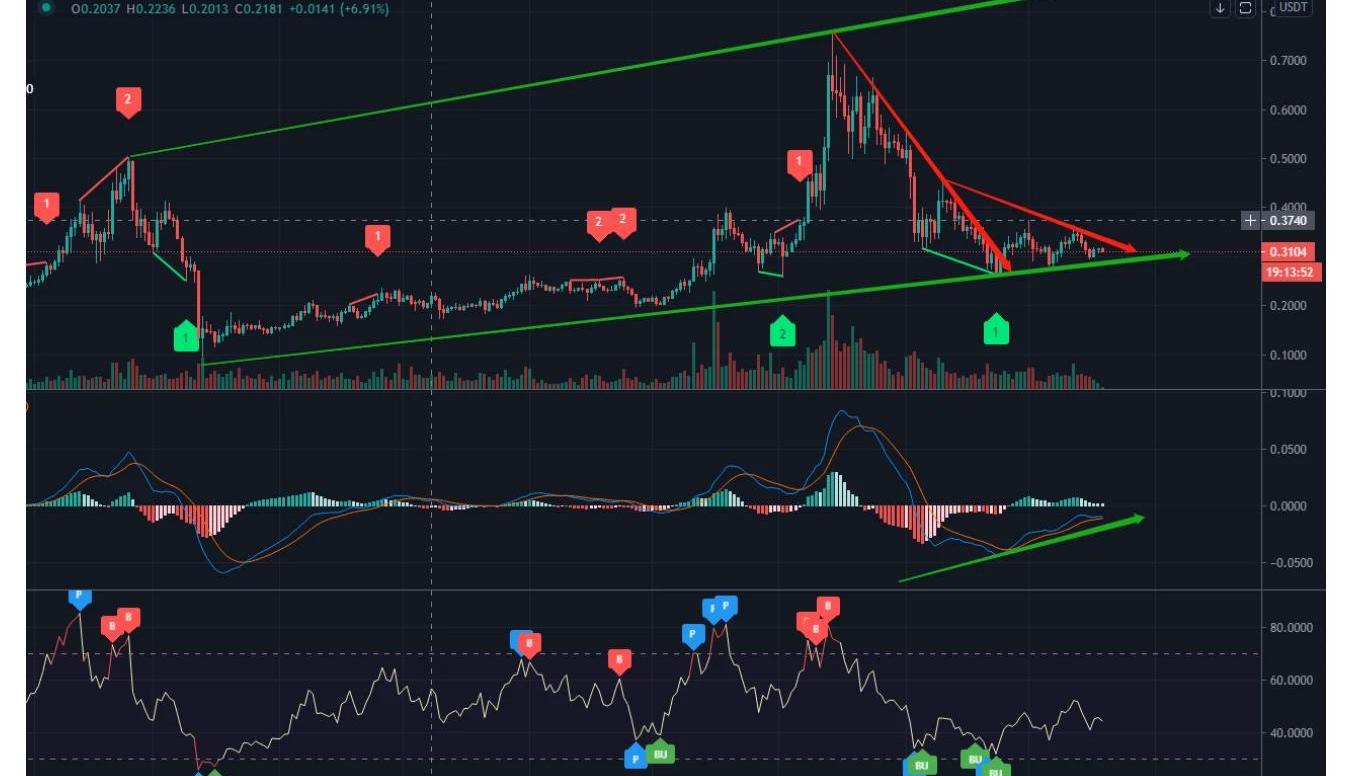 1.基本面长期LongTerm视角:Algorand在今年3-10月份继续着之前分析的合规化路线,USDC,BSN,Republic等合规企业与组织的陆续参与加入,也让这一路线得以健康的持续下去,2020年整体合作朝着更加长期化,国际化,精良化的方向发展。从近期陆续出现的BitmexCTO世间,Okex私钥持有者配合调查事件等可以发现,合规化路线与国际化路线,是未来区块链数字货币领域最重要核心的前提与得到大规模机构参与的大方向,只有搭建在合规基础上的基础设施与应用逻辑,才具有可期待的长期潜力价值。否则,被取代或者被限制只是时间与兴趣问题。上方提到的应用潜力案例也证明了这一趋势Algorand不断推出区块链领域内的创新性的概念与技术逻辑,如可变更私钥功能Rekeying,追溯Covid-19的区块链结合理念等,从商业角度和真正大规模可行性角度是有一定的实现空间的。相比较很多项目打擦边球,抄袭创意与抄袭代码,Algorand目前从项目整体开发思路与管理思路上是冲着真正解决行业痛点而去的。这是一个核心层面判断的加分项,至于之前出现的通证经释放问题与初期流通量过少价格被稀释问题,在2020年新的经济模型出台并运行一年后,从金融角度来看,已经产生了良好的作用,并让二级市场出现了较为积极的趋势走势。2.短期来看:2020年二级市场盘面6个月走势出现了我们在3月份分析的整体的上升再回调趋势,从$0.09最高达到了将近$0.8左右,再回调的走势,这里的上升与下降可能由以下几个综合原因形成:2020年开始由于释放机制的及时调整与更多合作的加入,总体有了较为健康的走势趋势,抛压降低,基础释放仅为3%,且区块链应用与开发基本面长期看好。陆续出台的USDT,USDC,BSN与马绍尔群岛的国家数字货币等消息出台后,有较为明显的刺激作用。3月份全球受COVID-19疫情蔓延到全球,导致全球整体经济与各类金融资产均有所大幅下滑。很多投资标的市值蒸发50%-90%,流动性危机导致3月份出现全球性资产价格暴跌,美股多次熔断,石油危机,黄金下跌,BTC也由于恐慌问题由最初的10000美金最低下跌到3800美金。而后续经济刺激政策的实施,也逐渐稳住了全球大幅动荡的局面,中国的优秀疫情防控,也使得人口最多的国家经济平稳下来,让全球经济得以在东方稳定。所以全年也出现了V型的反弹。价格走势健康,价格上扬,开启节点奖励机制,以鼓励长期共赢的模式,部分获利盘离开,对项目长期走势并不是坏事。其他分析师未知因素3.投机技术分析:2020-10-19日更新: