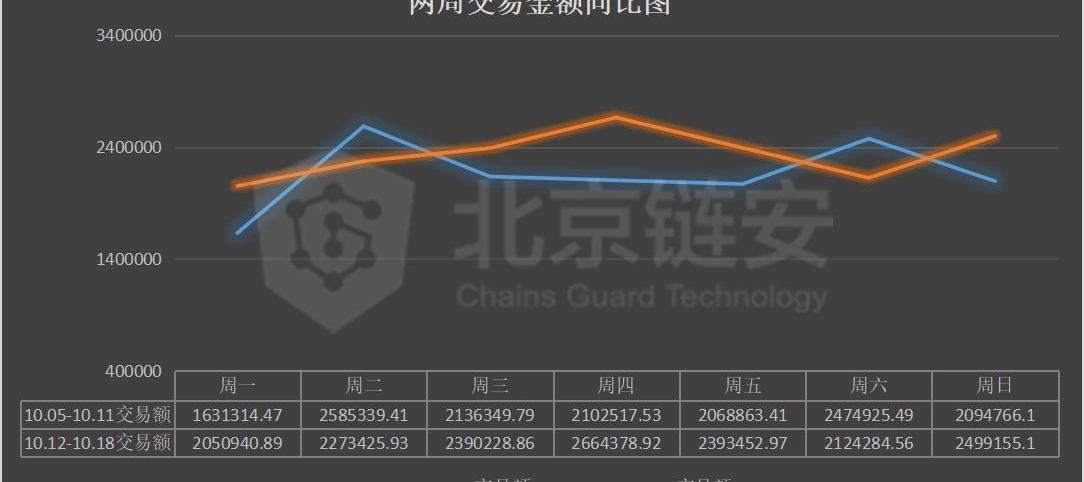 北京链安,聚焦区块链安全与数据服务,以下是基于北京链安ChainsMap链上数据监测系统,就上周数据发布的比特币链上数据周报。从过去一周数据来看,链上数据较前一周相比略有下降,大多数数据变化不大。而从交易所层面,众所周知,发生了大事件,OKEx暂停提币在比特币层面也对各大交易所产生了影响。那么,这起事件后,交易所收到的影响是全局性的,还是地域性的呢?我们将在本次周报为大家进行数据上的客观呈现。交易额:10.05-10.11:15094076.20BTC10.12-10.18:16395867.23BTC较之前一周上涨:8.62%详细数据图如下: