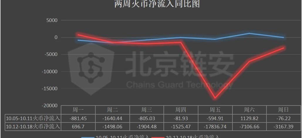 从数据来看,在比特币流入上,币安收到的影响较大,相较于上周出现了15%的降幅,但是比特币流出上表现稳定,由于其全球性交易所的特点,用户对其政策方面的风险体现出较强的信心。火币交易所BTC流向数据流入:10.05-10.11:31387.3610.12-10.18:30022.64详细数据图如下: