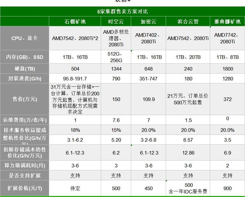 为方便对照,这张表再贴一次从整机性价比看,7大矿商中最低的不超过3GB/h/万元,最高的可达6GB/h/万元,其余厂商多在3.5-5GB/h/万元。再来看扣除存储成本的性价比,其中,时空云、西安灵动、滨合云智三家因为无法单独计算出存储成本而无法提供数据。“不能只算硬盘,硬盘或者存储机的成本占比相对比较小“,时空云科技COO胡锋表示,“要算也是算整个集群的成本,我们集群单T成本差不多1000/T。”当然,每家厂商技术方案和成本核算方式不一样,剩余4家矿商核算出了存储成本和扣除存储成本的性价比。先看存储成本,数据基本两极分化,YPOOL瑶池和熊猫矿机的存储成本在1-3万元左右,而黑犇科技和雅典娜矿池的存储成本有10万元之巨。对此,雅典娜矿池工作人员向Odaily星球日报表示,“我们提供给用户的是经过冗余后的实际使用存储,不是只提供裸盘存储服务器,是按每T存储900元定价,900*120=108000元。“黑犇科技也表达了类似想法。再看扣除存储成本的性价比,参数低为4.5GB/h/万元,其余厂商多在4.5-6GB/h/万元之间。看到这,你可能有种心里有数的感觉。但其实,和矿机性价比息息相关的还有两项参数,运维费用和技术服务收益提成,因为非标而没有写入公式中,在此提醒投资者们将其纳入考量范围。在7大厂商中,雅典娜矿池、西安灵动是将两者打包,共收取收益的20%作为服务费,而YPOOL瑶池、黑犇科技、时空云和滨合云智则对运维收取固定费用,价格在1-1.8万元/套/年,技术服务费收取收益的10%-20%。熊猫矿机采取首年免运维的政策,技术服务费收取收益的15%。最后看算力填满耗时,这主要由矿机的硬盘容量和封装速度大小决定。这一数据影响到投资者何时能获得理论算力值以及后续扩展算力的速度。整体而言,以西安灵动为代表的4家厂商满存耗时较短,最迟2个月,耗时较长的厂商约需3-6个月。满存后,各厂商均支持扩展算力,此时我们需要关注厂商提供的扩展价格,它决定了继续投资的成本。除了西安灵动尚未测算好扩展价格外,其余厂商的扩展算力定价多在300-500元/T之间,雅典娜价格相对高一些。3大厂商云算力解决方案