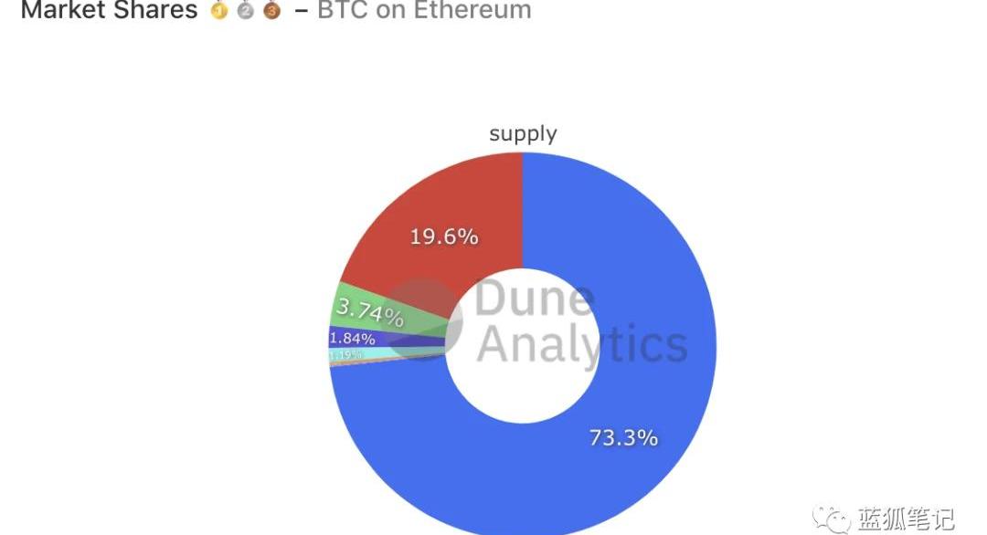 这张图向我们展示了过去几个月时间,跟DeFi协议发生过交互的地址数量的增长情况。每天新增5000个新地址,这说明DeFi新用户增长迅速,同时也可以看到DeFi还处于非常早期,整体用户规模还很小,甚至跟整体加密交易市场用户相比,也只不过是1%左右的规模。这里还有很大空间可以扩展。3.以太坊上流通的BTC当前以太坊上流通的BTC的总量超过12.7万个,占据BTC总量的0.608%,价值超过13亿美元,其中wBTC占据了绝大多数的市场份额,目前超过70%。