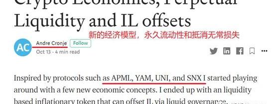 也许是极客精神使然;也许是YFI的成功过于辉煌。有再一再二,还有再三再四。尽管“退出”腿特,但是AC仍然没有放弃通过社交媒体Po出自己的新项目。10月13日,AC在Medium撰文:受“AMPL、YAM、UNI、SNX”的启发”,自己正在为“改进”AMM机制,探索新的tok.en模型。