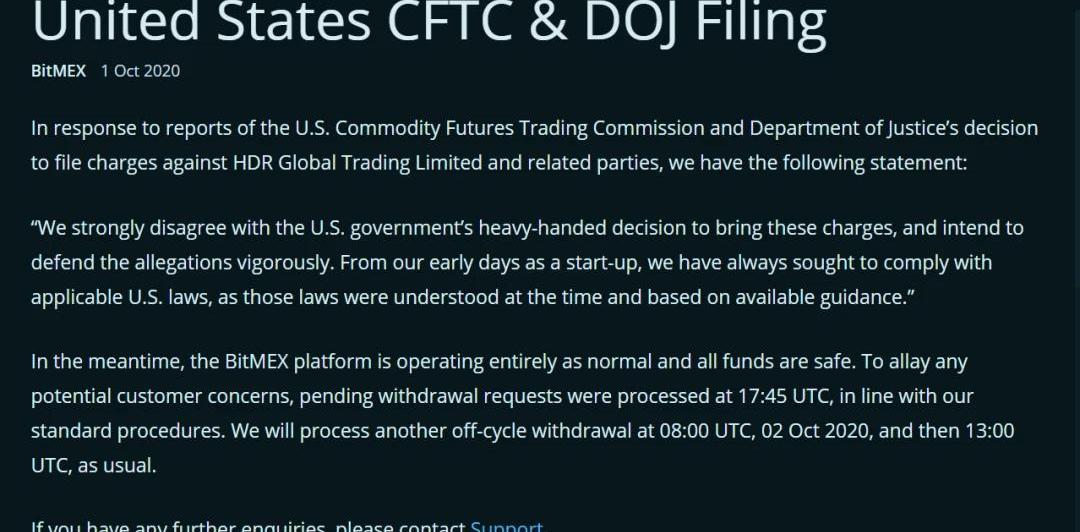 编者按:本文来自区块律动BlockBeats,作者:0x290x66,Odaily星球日报经授权转载。北京时间10月2日凌晨,刚刚进入2020年最后一个季度第一天的美国传来两则重磅消息:一是,美国监管层对全球最大加密货币交易平台之一BitMEX的高管和实体公司提起诉讼;二是,BitMEXCTO已经被逮捕。当地时间10月1日,美国司法部和美国商品期货交易委员会分别对BitMEX的创始人及三位高管发起了刑事和民事指控,称其串谋违反美国《银行保密法》、运营未注册的交易平台、涉及违反KYC和反相关的监管法规。