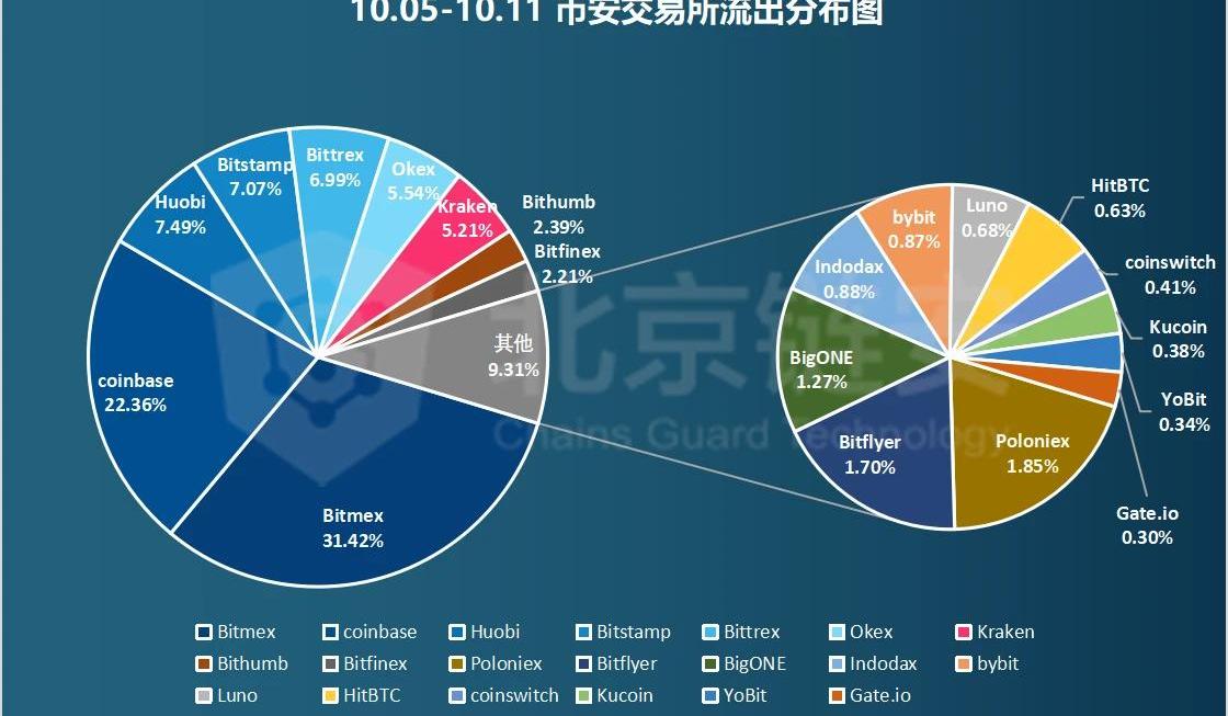 根据流出分布图可以看出,正经历调查的Bitmex在各大交易所的流出占比都明显下降,与此同时coinbase的地位明显提升,或许这起Bitmex的危机中,coinbase正成为受益的一方。注:以上比例根据各交易所流出到已确定主体地址中的分布计算,排除了未确定主体的地址和独立地址,即在交易所流出的所有比特币中,相关主体的实际占比会更小一些。