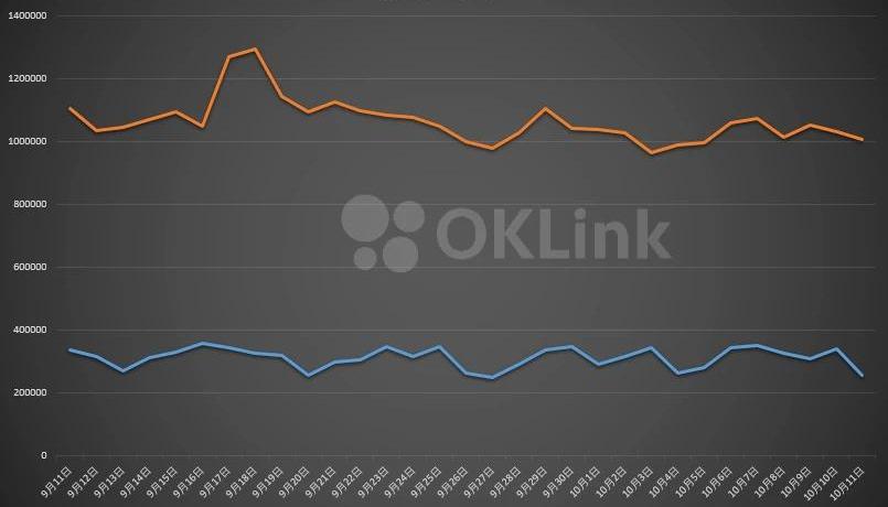 北京时间10月5日至10月11日比特币和以太坊链上数据周报。活跃地址数