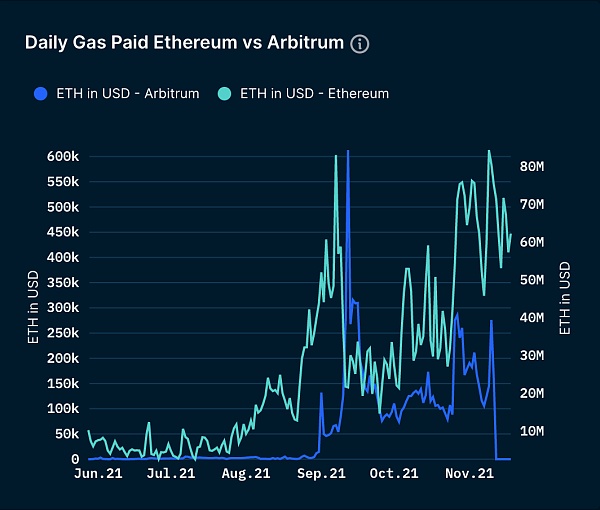 上图:Arbitrum 网络每日的 Gas 总费用 (蓝线) 对比以太坊网络每日的 Gas 总费用 (绿线)。