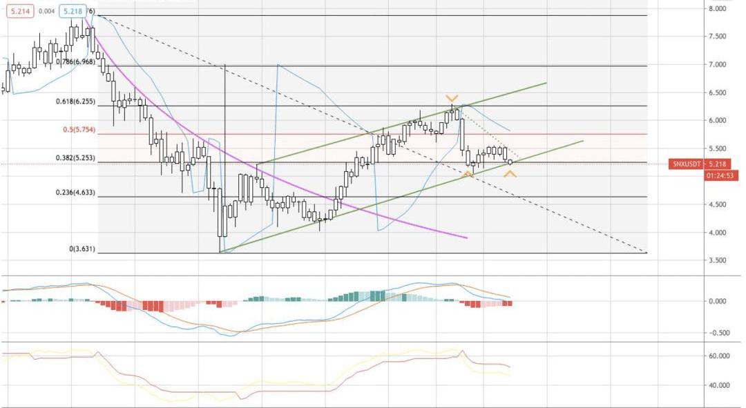 SNX/USDFibonaccilevel可能出现的波动那么这就给SNX留下了两种明确的可能性。SNX要么开始新的下跌趋势,虚线绿线作为新的阻力线,看到突破当前的上行支撑。这将使SNX回落至0斐波那契水平,跌至4美元以下。另一种可能是,SNX可以在0.386找到支撑,并以此为支点,推动自己上破0.618斐波那契水平,飞向6美元上方。如果遵循蓝线,将看到SNX保持在当前的形态内。